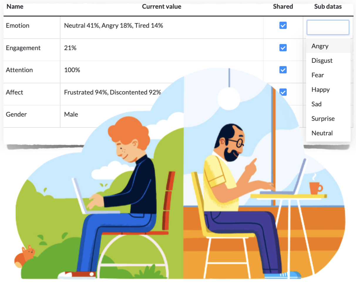 Immersively.care sends your emotion, attention level, and other health data to other video call's participants without your personal identity attached to them. Participants view your data as a graphical overlay of metrics on their screen. Participants cannot extract, download or share your data.