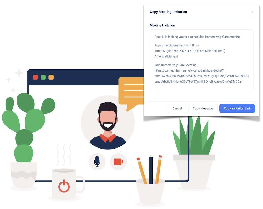Immersively.care makes it easy to join a meeting from any browser using a 1-click link. A unique random passcode is generated and embedded in the link. Its validity is restricted between the start and end times of the meeting. Meetings are limited to two participants, disallowing uninvited guests to join. The same meeting link cannot be used twice.